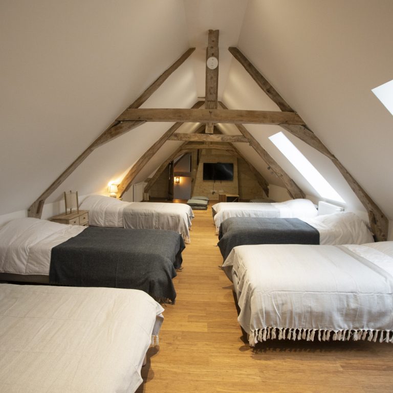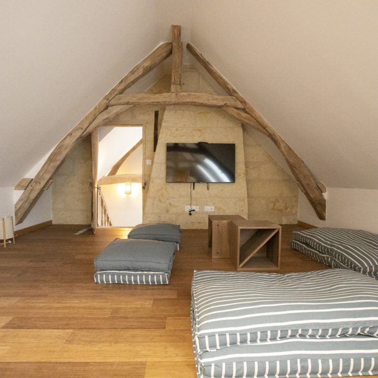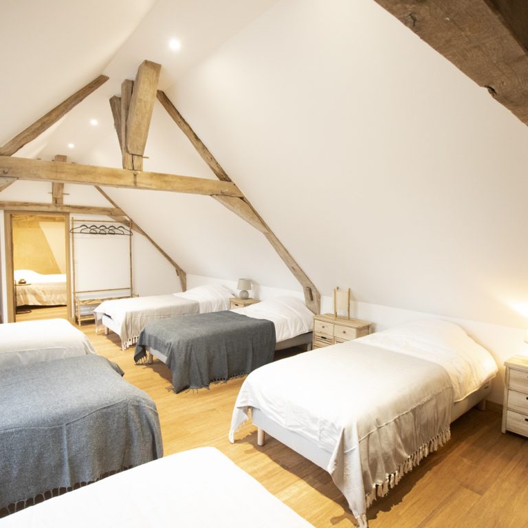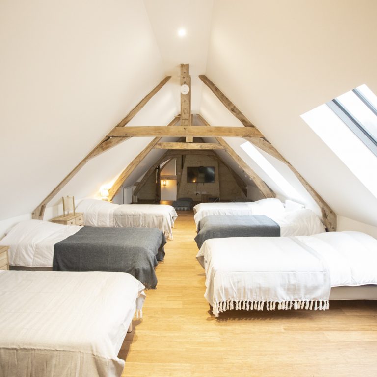 Découvrez le dortoir à l’étage du gite, composé 6 lits simples et d’un espace télé.
